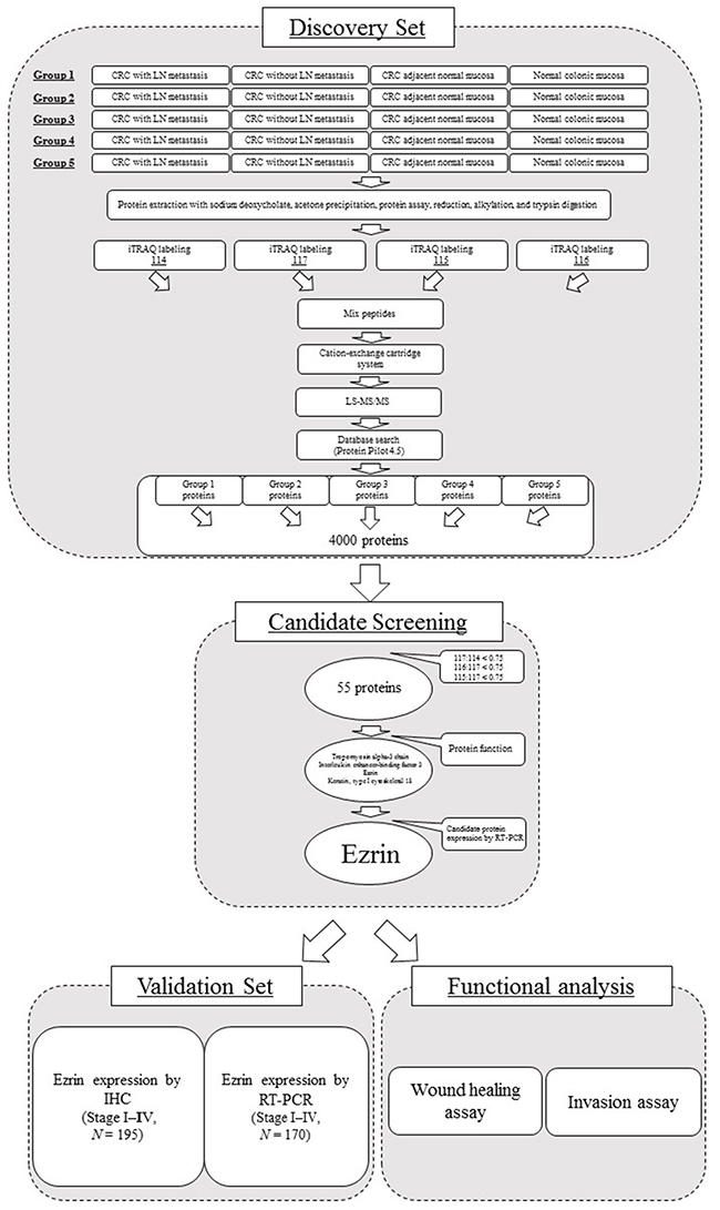 CRC, colorectal cancer; CT, computed tomography; ERM, ezrin–radixin–moesin; FFPE, formalin-fixed paraffin-embedded; HR, hazard ratio; IHC, immunohistochemistry; iTRAQ, isobaric tags for relative and absolute quantitation; LC, liquid chromatography; LN, lymph node; MRI, magnetic resonance imaging; MS, mass spectrometry; OS, overall survival; PANTHER, Protein Analysis through Evolutionary Relationship; ROC, receiver operating characteristic