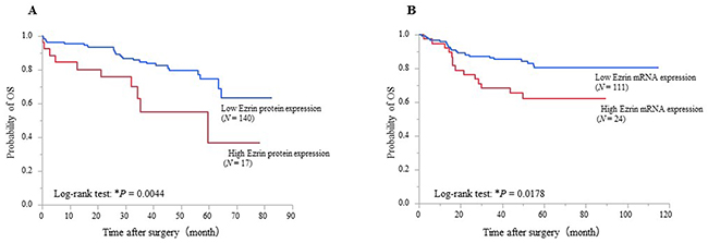cThe cut-off values for high/low Ezrin expression were 5.0 for protein and 0.58 for mRNA.