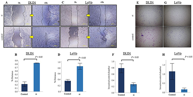 We studied the cellular function of ezrin on migration and invasion by examining DLD1 and LoVo cells at 48 h after transfection with ezrin-targeting or negative control siRNA. We first performed wound healing assays to examine tumor cell motility and found that the migratory ability of both DLD1 and LoVo cells was significantly reduced by transfection with ezrin siRNA compared with control siRNA (Figure 4A-4D). Similar results were obtained in invasion assays, which showed that ezrin knockdown significantly decreased the invasiveness of DLD1 and LoVo cells compared with control cells (Figure 4E–4H).