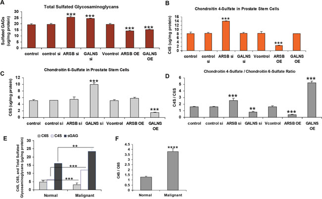 Figure 2: Total sulfated GAGs, C4S, C6S, and C4S/C6S ratio in human prostate stem cells and prostate tissue. (A) Total sulfated glycosaminoglycans (GAGs) were measured using the BlyscanTM assay which detects sulfated GAGs by binding to 1,9-dimethylmethylene blue. In the prostate stem cells, total sulfated glycosaminoglycans (GAGs) were increased following silencing of ARSB or of GALNS (p<0.001, n=3). In contrast, overexpression of ARSB or of GALNS decreased the total sulfated GAGs (p<0.001, n=3). (B) Chondroitin-4-sulfate (C4S) was measured by the BlyscanTM assay, following immunoprecipitation by antibody specific for C4S. C4S was significantly increased following ARSB silencing and reduced when ARSB was overexpressed (p<0.001, n=3). Changes in GALNS expression did not affect the level of C4S. (C) Chondroitin 6-sulfate was detected by the BlyscanTM assay, following immunoprecipitation with an antibody specific for C6S. When GALNS was silenced, chondroitin 6-sulfate (C6S) increased significantly, and declined when GALNS was overexpressed (p<0.001, n=3). Changes in ARSB expression did not affect the C6S level. (D) The C4S/C6S ratio was calculated and shown to be increased when ARSB was silenced or GALNS was overexpressed (p<0.001, n=3). The ratio was reduced when ARSB was overexpressed or GALNS was silenced. (E) In the human prostate tissues, C6S and C4S were measured by the BlyscanTM assay. C4S was increased and C6S was reduced in the malignant tissue (p<0.001, n=6; unpaired t-test, two-tailed), consistent with decrease in ARSB activity and increase in GALNS activity. Overall, total sulfated GAGs were significantly increased in the malignant tissue, compared to the normal tissue (p<0.01, n=6). (F) The C4S/C6S ratio was calculated and was increased in the malignant tissue, compared to the normal tissue (p<0.001, n=6; unpaired t-test, two-tailed). [ARSB=arylsulfatase B=N-acetylgalactosamine-4-sulfatase; C4S=chondroitin 4-sulfate; C6S=chondroitin 6-sulfate; GALNS=galactosamine-(N-acetyl)-6-sulfatase; N-acetylgalactosamine-6-sulfatase; galactose-6-sulfate sulfatase; GAG=glycosaminoglycan; OE=overexpressed; si=siRNA].