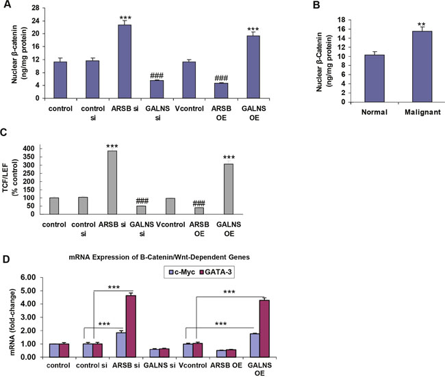 Figure 3: Effects of ARSB and GALNS on Wnt/ß-catenin signaling. (A) Nuclear β-catenin was measured by ELISA in nuclear extracts of the prostate stem cells following ARSB and GALNS silencing and overexpression. Nuclear ß-catenin increased significantly following ARSB silencing or GALNS overexpression (p<0.001, n=3). Inversely, GALNS silencing or ARSB overexpression reduced the nuclear ß-catenin (p<0.001, n=3). (B) Nuclear ß-catenin was measured in nuclear extracts from normal and malignant human prostate tissue. Nuclear ß-catenin was significantly increased in the malignant tissue (p<0.01, unpaired t-test, two-tailed, n=6). (C) Nuclear DNA-bound TCF/LEF was determined by a transcription factor reporter assay in the prostate stem cells. A biotin-labeled TCF/LEF DNA binding sequence probe which detected TCF/LEF bound to DNA was mixed with nuclear extracts to form TCF/LEF-DNA complexes. A filter plate was used to retain the bound DNA probe and remove free probe. The bound prelabeled DNA probe was eluted from the filter and collected for quantitative determination. The bound TCF/LEF increased following either ARSB silencing or GALNS overexpression (p<0.001, n=3). In contrast, ARSB overexpression and GALNS silencing inhibited the increase (p<0.001, n=3). (D) Further demonstration of the impact of the chondroitin sulfatases was shown by effects on the mRNA expression of Wnt/ß-catenin dependent genes. QPCR showed increased expression of c-Myc and GATA-3 following ARSB silencing or GALNS overexpression. In contrast, overexpression of ARSB or silencing of GALNS reduced the mRNA expression of c-Myc and GATA-3 (p<0.001, n=6). [ARSB=arylsulfatase B=N-acetylgalactosamine-4-sulfatase; C4S=chondroitin 4-sulfate; C6S=chondroitin 6-sulfate; GALNS=galactosamine-(N-acetyl)-6-sulfatase; N-acetylgalactosamine-6-sulfatase; galactose-6-sulfate sulfatase; GAG=glycosaminoglycan; OE=overexpressed; si=siRNA; TCF/LEF=T-cell factor/lymphoid enhancer-binding factor].