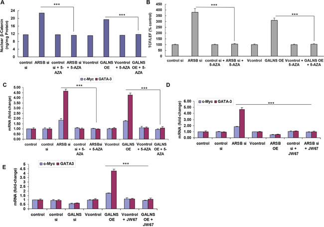 Effects on the ARSB- and GALNS-mediated changes in the mRNA expression of c-Myc and on GATA-3 were inhibited by both 5-azacytidine (Figure 4C) and JW67 (Figure 4D, 4E), an inhibitor of Wnt/β-catenin pathway activation.