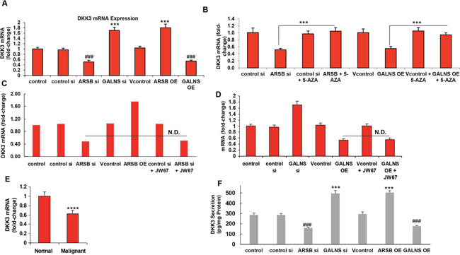 Figure 5: Dickkopf inhibitor of Wnt signaling pathway (DKK3) expression is inhibited by ARSB knockdown or GALNS overexpression. (A) In contrast to the increased expression of c-Myc and GATA-3 when ARSB was silenced or GALNS overexpressed, the mRNA expression of DKK3, an inhibitor of Wnt signaling, was reduced by ARSB silencing or by GALNS overexpression (p<0.001, n=6). Inversely, GALNS silencing and ARSB overexpression increased the DKK3 mRNA (p<0.001, n=6). (B) The declines in mRNA expression of DKK3 induced by ARSB silencing or GALNS overexpression were reversed by treatment with 5-azacytidine (10 μM x 24h) (p<0.001, n=6), consistent with dependence on DNA methylation. (C) In contrast to the impact of JW67 on mRNA expression of c-Myc and GATA-3, inhibition of the Wnt/ß-catenin signaling pathway by JW67 (4 mg/ml x 24 h) had no impact on the mRNA expression of DKK3 following ARSB silencing (p<0.001, n=6). This indicated that the effect of the chondroitin sulfatases on DKK3 expression was independent of activation of the Wnt/ß-catenin signaling pathway. (D) JW67 had no impact on mRNA expression of DKK3 following GALNS overexpression (p<0.001, n=6). (E) In the malignant prostate tissue, the DKK3 mRNA was significantly reduced, compared to the level in the normal prostate tissue (p<0.0001, unpaired t-test, two tailed; n=6). (F) The DKK3 secreted into the spent media of the prostate stem cells was determined by ELISA. Levels were significantly reduced by either ARSB silencing or GALNS overexpression, and increased when ARSB was overexpressed or GALNS was silenced (p<0.001, n=3). [ARSB=arylsulfatase B=N-acetylgalactosamine-4-sulfatase; 5-AZA=5-azacytidine; DKK=Dickkopf inhibitor of Wnt signaling pathway; GALNS=galactosamine-(N-acetyl)-6-sulfatase; N-acetylgalactosamine-6-sulfatase; galactose-6-sulfate sulfatase; OE=overexpression; si=siRNA].