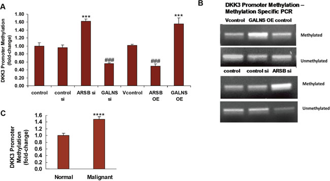 The epigenetic mechanism by which decline in ARSB or increase in GALNS reduced the expression of DKK3 was investigated. The impact of ARSB and GALNS on methylation of the DKK3 promoter was investigated by methylation-specific QPCR using primers specific for the methylated and unmethylated DKK3 promoter. ARSB silencing and GALNS overexpression increased the DKK3 promoter methylation, in contrast to ARSB overexpression and GALNS silencing which reduced the methylation (Figure 6A). Representative DNA gels demonstrated increased band intensity of the DKK3 promoter following ARSB silencing and GALNS overexpression (Figure 6B). Methylation of the DKK3 promoter in malignant prostate tissue was also significantly increased, compared to the normal tissue (p<0.0001, unpaired t-test, two tailed; n=6) (Figure 6C).