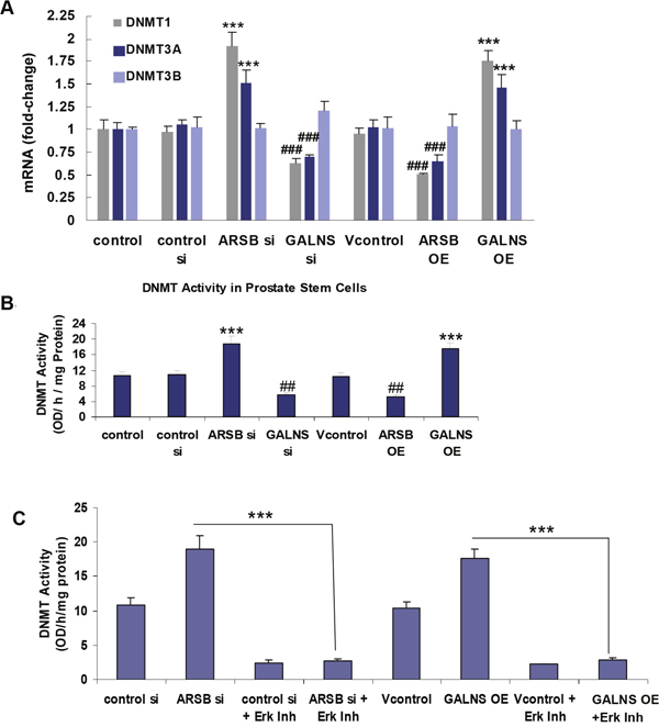 Since the impact of decline in ARSB was mediated by increased phospho-ERK1/2 in other experiments [12], the impact of ERK inhibition on the ARSB-induced increase in DNMT activity was addressed in the prostate stem cells. Treatment with the ERK activation inhibitor peptide I blocked the increase in DNMT activity induced by ARSB silencing and by GALNS overexpression (Figure 7C).