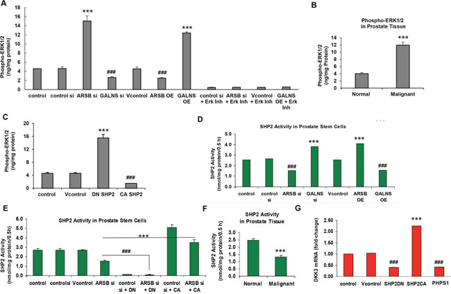 Since inhibition of SHP2 increased the phospho-ERK1/2 in previous experiments [12], the impact of SHP2 inhibition was determined in the prostate stem cells. Dominant negative (DN) SHP2 markedly increased the phospho-ERK1/2, which was reduced by constitutively active (CA) SHP2 (p<0.001; n=3) (Figure 8C).
