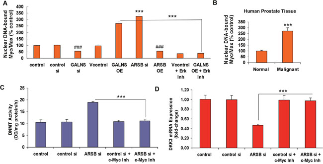 Figure 9: Impact of chondroitin sulfatases on DKK3 expression requires phospho-ERK1/2 and activation of c-Myc. (A) Nuclear DNA-bound Myc/Max was detected by a transcription factor reporter assay (Signosis, Sunnyvale, CA) in nuclear extracts from control- and treated cell samples. A biotin-labeled c-Myc DNA binding sequence probe which detected Myc/Max bound to DNA was mixed with nuclear extracts to form c-Myc-DNA complexes. A filter plate was used to retain bound DNA probe and remove free probe, and the bound prelabeled DNA probe was eluted from the filter and collected for analysis. DNA-bound Myc/Max was significantly increased by both GALNS overexpression and ARSB silencing (p<0.001, n=3). Inversely, GALNS silencing and ARSB overexpression reduced the nuclear DNA-bound Myc/Max (p<0.001, n=3). The ERK activity inhibitor peptide I (10 μM x 24 h) effectively blocked the effect of GALNS overexpression, indicating a requirement for phospho-ERK1/2 for the GALNS overexpression-induced increase in nuclear DNA-binding of Myc/Max (p<0.001, n=3). (B) In malignant prostate tissue, the nuclear DNA-bound Myc/Max was ~2.7 times the level in the normal tissue (p<0.001, n=6; unpaired t-test, two-tailed). (C) In the presence of a c-Myc inhibitor ((Z, E)-5-(4-Ethylbenzylidine)-2-thioxothiazolidin-4-one; 64 μM x 24 h) which inhibits Myc/Max dimerization, the increase in DNMT activity which followed ARSB silencing was inhibited (p<0.001, n=3). (D) Treatment by the c-Myc inhibitor increased the DKK3 mRNA following ARSB silencing (p<0.001, n=6), indicating a requirement for c-Myc in the ARSB knockdown-initiated inhibition of DKK3 expression. [ARSB=arylsulfatase B; DKK=Dickkopf Wnt inhibitory factor; DNMT=DNA methyltransferase; ERK=extracellular regulated kinase; GALNS=galactosamine-(N-acetyl)-6-sulfatase; N-acetylgalactosamine-6-sulfatase; galactose-6-sulfate sulfatase; Inh=inhibitor; OE=overexpression; si=siRNA].