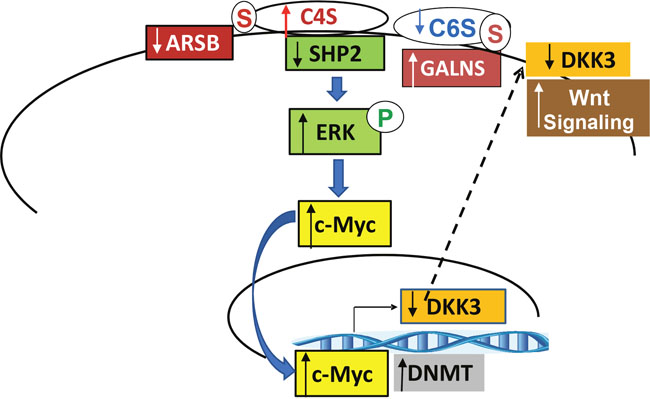 The schematic of the cascade initiated by changes in chondroitin sulfatases demonstrates a pathway from the inhibition of SHP2 by increased C4S. This pathway involves increases in phospho-ERK1/2, Myc/Max activation, and DNMT activity, leading to an epigenetic mechanism which can regulate Wnt signaling by increased methylation of the DKK3 promoter. Since DKK3 is an inhibitor of Wnt signaling, reduced DKK3 expression increases Wnt/β-catenin signaling (Figure 10).