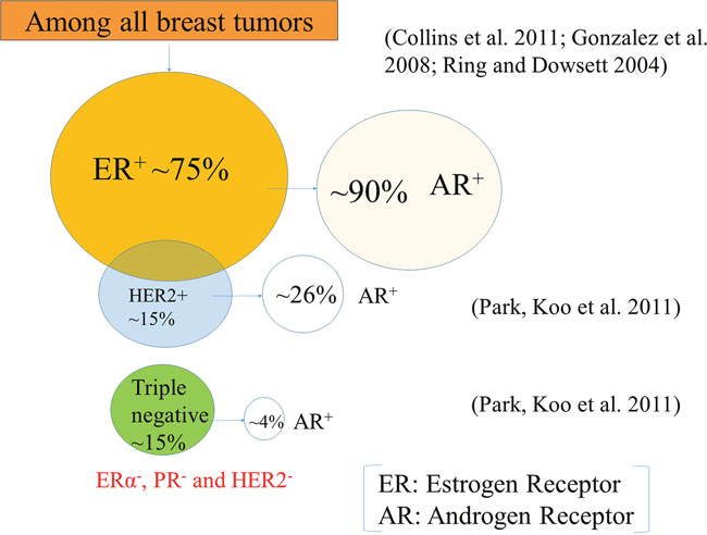 Figure 1: Breast tumor subtypes. Roughly 75% of the tumors express the estrogen receptor (ER), and ~15% of the tumors express the human epidermal growth factor receptor 2 (HER2), and almost 15% triple-negative breast cancers do not express ER, progesterone receptor (PR), and HER2. Interestingly, a significant portion (~90%) of ER-positive (ER+) breast tumors are also androgen receptor (AR) positive (AR+) ones. On the other hand, a very few percentage of HER2+ (26%) and TNBC (4%) express AR.
