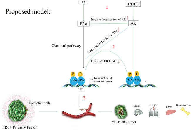 Figure 4: The classical pathway showing E2 and DHT action. In this scheme, AR induces metastasis by regulating ERα transcriptome via recruiting ERα to the promoters of the genes responsible for the metastatic phenotypes. (1) The left side indicates that when E2 binds to ERα it (ERα) it gets recruited to the promoter of ER-responsive genes (EREs). Similarly, DHT stimulates AR activation and its recruitment to the specific DNA motifs. (2) Since AR can also binds and compete to EREs and as well as it can facilitate ER binding via recruitment of other pioneer factors like FOXA1 or long-range promoter-enhancer interaction (need to be further research). (3) In this way, the associated gene expression changes may induce breast cancer phenotypes and its subsequent metastasis in post-menopausal women with breast cancer patients.