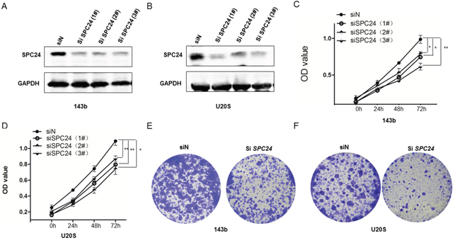 Figure 1: SPC24 knockdown decreases growth, viability and colony formation in 143B and U2OS cells. (A-B) Representative western blot images showing SPC24 expression in siSPC24 and siN transfected (A) 143B and (B) U2OS cells. β-actin is the loading control. (C-D) MTT assay showing viability of siSPC24 and siN transfected (C) 143B and (D) U2OS cells at 24, 48 and 72 h. (E-F) Soft-agar colony formation assay showing crystal violet stained colonies from siSPC24 and siN transfected (E) 143B and (F) U2OS cells. Note: * denotes p < 0.05 compared to control; **denotes p < 0.01 compared to control.