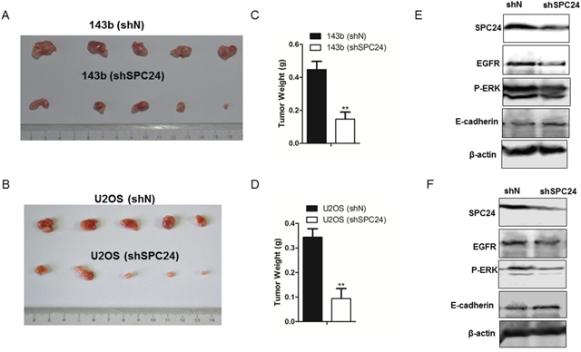 Next, we investigated the effects of SPC24 knockdown on in vivo osteosarcoma progression by xenografting control and SPC24 knockdown OS cells into dorsal flanking sites of 5 week old nude mice. We observed that the size and weight of shSPC24 tumors were highly reduced than shN tumors (p<0.01; Figure 5A-5D). Western bolt analysis demonstrated decreased EGFR and p-ERK as well as increased E-cadherin in shSPC24 tumors than shN tumors (Figure 5E-5F).