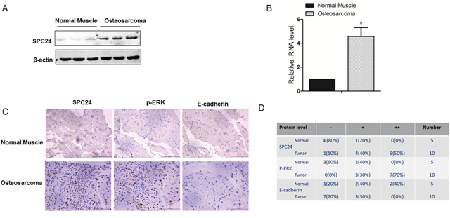 Figure 6: Human osteosarcoma patient tissues show increased SPC24 and p-ERK and decreased E-cadherin levels. (A) Representative western blot shows SPC24 levels in normal and OS patient tissue samples. B-actin was used as control. (B) QRT-PCR analysis of SPC24 mRNA levels in normal and OS patient tissue samples. (C) Representative images (magnification: 20x) show immunohistochemical staining of SPC24, p-ERK and E-cadherin in normal and OS tissue samples (Scale bar, 125μm). (D) Semiquantitative analysis of SPC24, p-ERK and E-cadherin expression in normal and OS cancer tissue samples based on immunohistochemical staining.