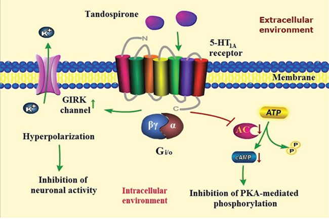 Figure 1: A proposed scheme of tandospirone and its signal transduction pathway in the treatment of anxiety disorders. Tandospirone activats postsynaptic 5-HT1A receptor coupled with G-protein (Gi/o), resulting in inhibition of protein kinase A (PKA)-mediated protein phosphorylation and neuronal activity.