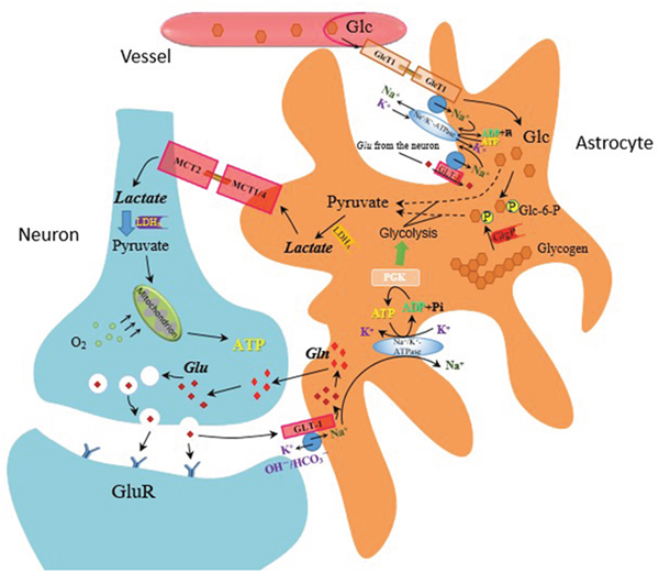 Figure 3: The astrocyte-neuron lactate shuttle hypothesis—mechanism of lactate production on glutamate release. Glucose (Glc) from the blood circulation is converted to lactate by astrocytes accompanied by glutamate (Glu) uptake.