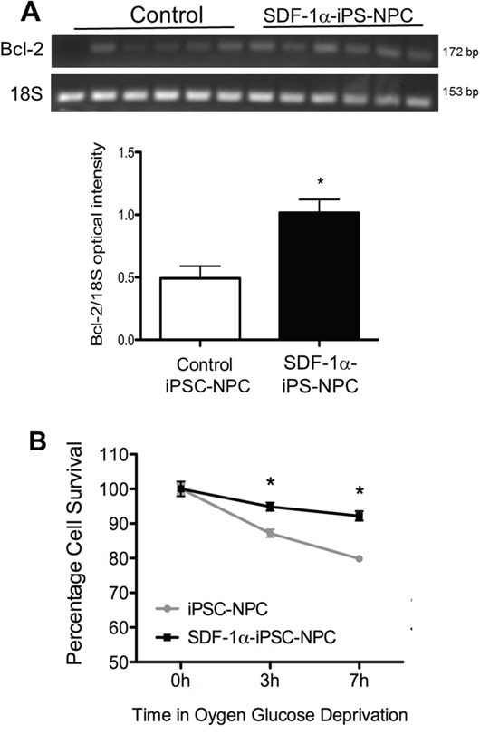 Figure 3: SDF-1α expression increased cell survival after in vitro ischemic insult. (A) PCR analysis showed that Bcl-2 was upregulated in SDF-1α cells compared to control cells (n=6, *. p=0.0045). (B) To test survival, cells were challenged with oxygen-glucose deprivation (OGD) in a hypoxia chamber for 3 or 7 hrs followed by 12h of “reperfusion” in normoxia. Cell viability was then measured using MTT assay. SDF-1α-iPS-NPCs exhibited greater viability after OGD compared to control cells (n=4-6, *. p=0.0006). The mean and standard error of the mean are plotted in the line graph.