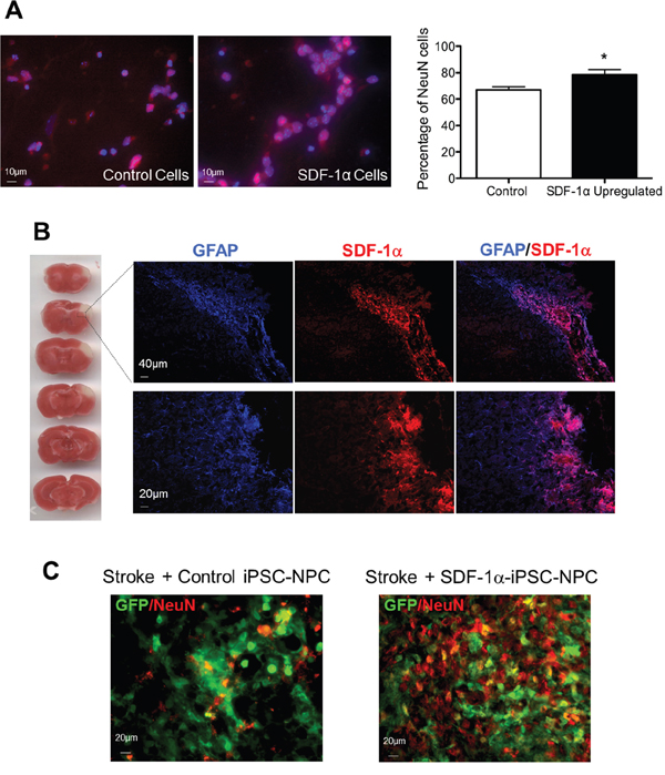 Figure 4: Expression of SDF-1α and neuronal differentiation of SDF-1α-iPS-NPCs in the post-ischemic brain. (A) In an in vitro assay, neurally induced SDF-1α-iPS-NPCs showed an increase in differentiation into NeuN-positive cells compared to control iPS-NPCs (n=6, *. p=0.037). The mean and standard error of the mean are plotted. (B) TTC staining (red) shows the cortical damage (white) in the sensorimotor cortex of the focal ischemic stroke model 24 hrs after the insult. Seven days after stroke, SDF-1α expression in the cortex was detected using immunohistochemical staining in different mice in the peri-infarct area (rectangular frame). These mice did not receive transplants. Here, TTC staining and immunofluorescence were in different mouse tissues. Many SDF-1 positive cells were also GFAP positive, consistent with astrocyte accumulation in the region at this time. (C) Two weeks after transplantation, transplantediPS-NPCs or SDF-1α-iPS-NPCs showed NeuN expression visualized with GFP/NeuN co-labeling in the peri-infarct area.