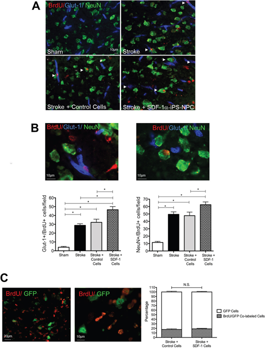 Figure 5: Transplantation of SDF-1α-iPS-NPCs increased regenerative activities in the post stroke brain. (A) In immunohistochemical staining, co-labeled NeuN/BrdU cells and Glut-1/BrdU cells (arrows) were used to detect newly formed neurons and endothelial cells in the peri-infarct area. (B) An enlarged image demonstrates the colocalization of NeuN (pink) and BrdU (white). (C) Pictures were captured from 4 areas 700-900 μm from the edge of the injury. Six tissue sections from each animal brain were quantified. The graphs here reflect the average number of co-labeled NeuN/BrdU and Glut-1/BrdU cells in the optical field. There were significantly more NeuN/BrdU-positive cells (n=10; *. p=0.015) and Glut-1/BrdU-positive (n=10; *. p=0.0008) in the SDF-1α cell transplantation group compared to the sham, stroke only, and stroke + control cells groups, C. As a control, the majority of GFP-positive transplanted cells did not co-label with BrdU and there was no difference in proliferation between iPS-NPCs and SDF-1α-iPS-NPCs (n=4 per group, *. p=0.5) after transplanting these cells in vivo, suggesting that the increased regeneration observed was mainly due to endogenous cells. Mean ± SEM.