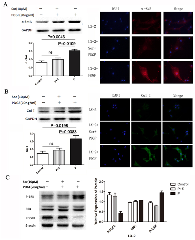 Figure 1: Activation of the LX-2 cell line using PDGF with or without Sorafenib. PDGF alone or in combination with sorafenib was used to treat LX-2 cells. Stimulation of the PDGFR signaling pathway was detected by measuring levels of the downstream proteins SMA (A), Col-I (B), and ERK (C). Immunofluorescence staining and western blotting showed that the levels of SMA and col-I increased significantly in the PDGF only group (P), whereas no increase was detected between the control and PDGF + sorafenib (P+S) groups (A and B). Western blotting showed that while PDGF stimulation increased phosphorylation levels of ERK in the PDGF alone (P) group, this increase was inhibited by sorafenib in the combination group (P + S).