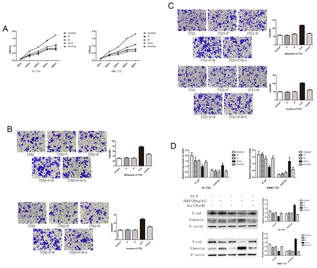 Figure 2: EMT and cell migration in SMC-7721 and HL-7702 cell lines treated with PDGF or sorafenib or activated LX-2 supernatant either alone or in combination. (A) Effect of different treatments on cell proliferation rates in HL-7702 and SMC-7721 cell lines. A significant increase was detected in cell proliferation rates in both cell lines treated with PDGF-activated LX-2 supernatant (P + H). This increase was inhibited by the addition of sorafenib in both cell lines (P + H + S). (B and C) Transwell migration assay results indicated that the rate of cell migration increased in both cell lines treated with PDGF-activated LX-2 supernatant (P + H). This increase was inhibited by the addition of sorafenib (P + H + S). (D) Western blot analysis showed that the treatment with activated LX-2 supernatant (LX-2) decreased the levels of E-cadherin and increased level of vimentin. The addition of sorafenib (Sor) inhibited this change in protein expression. Importantly, the use of PDGF alone had no effect on these protein levels in either cell line.