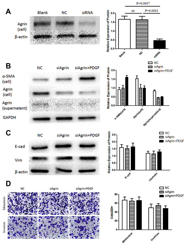 To characterize the functional role of agrin in HSC and HCC cell lines, agrin was also depleted in the HSC cell line LX-2 by transfecting with siRNA pool, by which effective agrin knockdown was achieved (Figure 4A). In agrin-depleted cells, the expression of agrin was not significantly different between PDGF-treated and untreated cells (Figure 4B). There was significant difference of cell protein (α-SMA) between the control group and the agrin-depleted groups (Figure 4B). However, the expression of agrin in culture supernatant kept on the same level in the agrin-depleted cells, because the level of agrin has been on a very low level in quiescent LX-2 supernatant, and the depletion cannot decrease the secretion of agrin further. As a result, when SMMC-7721 co-cultured with both quiescent and agrin-depleted LX-2, the transwell assay did not demonstrate any difference on the migration and invasion ability (Figure 4D). There were surely no significant differences on the expression of E-cadherin and vimentin as a matter of course (Figure 4C).