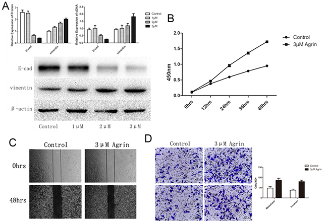 Figure 6: Effect of agrin supplementation on cell proliferation, migration, and EMT of SMMC-7721 cells. (A) The effect of agrin supplementation on the expression of the EMT marker vimentin. Increasing concentrations of agrin caused an upregulation of vimentin expression and a lowering of E-cadherin expression. (B) Cells supplemented with 3-μm agrin showed a marked increase in their ability to proliferate. (C and D) Wound-healing (C) and transwell migration (D) assays showing the metastatic and invasive ability of the cells. Both the invasive and metastatic ability of the cells supplemented with 3-μm agrin increased in comparison with the controls.
