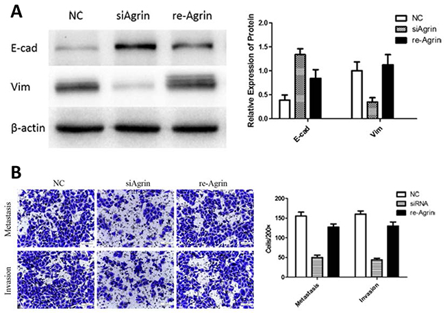 We next rationalized that restoring agrin should rescue the effects caused by agrin siRNA if these phenotypes are primarily attributable to reduced levels of agrin. Hence, we added 3-μM soluble recombinant agrin in agrin knockdown SMMC-7721 cells. The results indicated that recombinant agrin rescue the metastasis, and invasion ability of SMMC-7721 cells as proved by transwell assays (Figure 7B). Compared with the agrin-depleted group, agrin restoration increased vimentin by 2.9 folds and reduced E-cadherin by 48% (Figure 7A). These results cumulatively validate the role of agrin as a secreted sensor regulating E-cadherin and vimentin-dependent cell attachment.