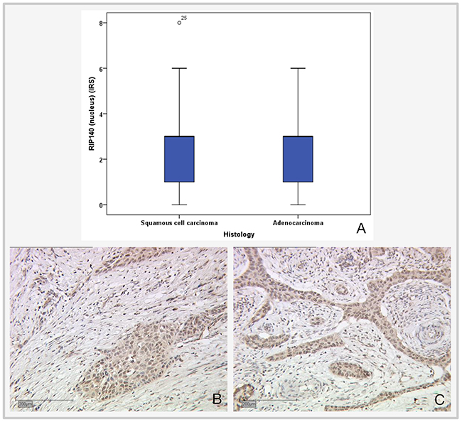 Figure 1: Expression of nuclear RIP140 in cervical epithelial tumor subtypes. (A) Boxplot of RIP140 expression and histological subtype. (B) Squamous cell carcinoma, n=192; median RIP140 expression: IRS 3; magnification x10. (C) Adenocarcinoma, n=47; median RIP140 expression: IRS 3; magnification x10.