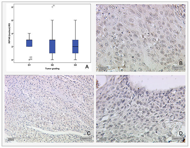 Figure 2: Correlation of nuclear RIP140 expression (IRS) and tumor grading. (A) Boxplot of RIP140 expression and tumor grading. (B) G1-stage tumors (n=19) with median RIP140 IRS score of 3; magnification x25. (C) G2-stage tumors (n=137) with median RIP140 expression of 3; magnification x10. (D) G3-stage tumors (n=75) with median RIP140 expression of 2; magnification x25.