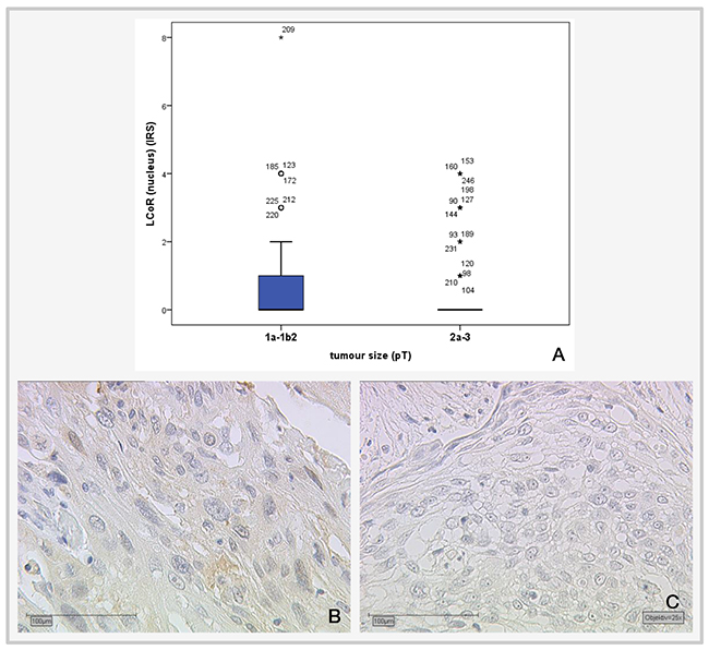 Correlation analysis of LCoR with various histopathological parameters (Table 2) showed that nuclear LCoR expression is significantly positively correlated with cytoplasmic LCoR (p<0.001), nuclear RIP140 expression (p=0.034, Spearman’s rho: 0.137) and H3K9ac (p=0.025, Spearman’s rho: 0.142) and negatively correlated with tumor size (p=0.039; Spearman’s rho: -0.131). A smaller tumor (pT1a-b) is associated with a higher LCoR IRS score and a larger tumor is associated with a lower IRS score (Figure 4). For cytoplasmic LCoR expression, a significant positive correlation with cytoplasmic RIP140 expression (p=0.001), E6 (p=0.022) and H3K4me3 (p=0.031) could be detected (Table 2). The correlation between cytoplasmic LCoR and E6 expression is also shown in Figure 5.