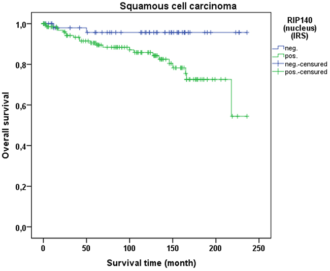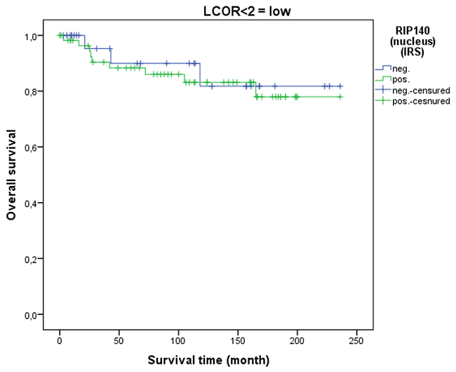 IBM SPSS Statistics for Windows, Version 22.0. Armonk, NY: IBM Corp. was used for data analysis. P-values lower than p<0.05 were considered statistically significant. Survival times were compared by Kaplan-Meier analysis, and differences in the OS times of patients were tested for significance by the Cox-Mantel log-rank test. Group comparisons of independent groups regarding ordinal analysis variables were tested with the Mann-Whitney U test or the Kruskal-Wallis test as appropriate. All histopathological variables which had been documented, have been tested in the multivariable analysis. Correlations between ordinal variables were tested using Spearman’s rank correlation coefficient. Cox regression analysis was used to compare the risk of death in patients with and without RIP140 and LCoR expression when the effects of further factors were accounted for. Independent variables included in the Cox regression model were RIP140 and LCoR expression, age, tumor size (pT) (T1-T4), histological subtype (Squamous cell carcinoma and Adenocarcinoma), tumor grade (G1, G2, G3), FIGO classification (Stage I-IVB) and lymph node status (pN) (pN0=no regional lymph node metastasis, pN1=regional lymph node metastasis). We used neither forward nor backward variable selection because all stepwise procedures have strongly be criticized [44, 45]. Variables were therefore selected based on theoretical considerations and forced into the model.