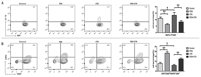 Figure 1: (A) Percentages of Th17/CD4+ cells in control samples or samples treated with prednisone alone (PDN), cytokines alone (CTK) or the combination of prednisone and cytokines (PDN + CTK). (B) Percentages of Treg/CD4+ cells in each of the four samples. Results shown are from five independent experiments. * P < 0.05, ** P < 0.01.