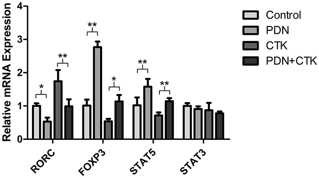 Figure 3: Relative levels of RORC, FOXP3, STAT5 and STAT3 mRNAs in control cultures and cultures treated with prednisone alone (PDN), cytokines alone (CTK) or the combination of prednisone and cytokines (PDN + CTK). Expression levels were normalized to that of GAPDH. Results shown are from three independent experiments. * P <0.05, ** P < 0.01.