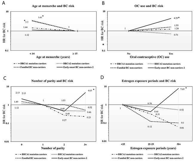 Earlier menarche increased the risk of BC in BRCA2 mutation carriers and non-carriers with FH of BC by threefold, but not in other two groups (HR≈1). Higher number of parity decreased BC risk by 80% in BRCA1 mutation carriers, but rather increased the risk for early-onset BC in non-carriers by approximately fourfold. OC use was associated with increased risk for only early-onset BC in non-carriers by fourfold. LEEP and later age at menopause decreased BC risk in BRCA1/2 mutation carriers and non-carriers with FH, whereas LEEP rather increased the risk for early-onset BC. Later age at FFTP among women aged ≤40 years was associated with decreased BC risk in BRCA1 mutation carriers, while showing an insignificantly increased association with the other three groups.