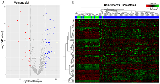 Figure 1: The pseudogenes expression characters in malignant gliomas and non-tumors controls. (A) Volcano plots showing the difference of pseudogenes expression between malignant glioma and non-tumor controls in GSE4290. The blue and the red points represent the upregulated pseudogenes and the downregulated pseudogenes in malignant glioma, respectively. |logFC|>1 and P<0.05 set as the criteria outlined. (B) Heat-map for the values of the different expression pseudogenes (DEPs). The green-shaded areas clustered as the high-expressed pseudogenes, and the magenta-shaded areas indicate the lower expression pseudogenes. Sample dendrogram shows the relatedness among samples. The blue and green bars represent the glioblastoma samples and non-tumor controls, respectively.