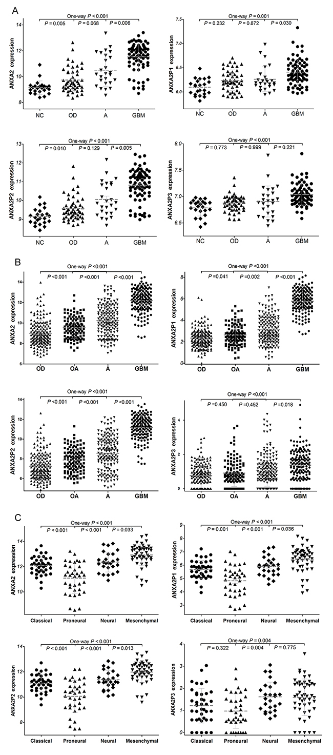 Figure 2: The expression of ANXA2 and ANXA2 pseudogenes in diffuse gliomas. (A) The ANXA2 and its pseudogenes expression were analyzed in glioma samples of the GSE4290 dataset. GBM vs OD, P<0.001 for ANXA2, P=0.004 for ANXA2P1 and P<0.001 for ANXA2P2. (50 cases of OD, 26 cases of A, 77 cases of GBM and 23 cases of NC). (B) ANXA2 and ANXA2 pseudogenes expression in glioma samples of TCGA dataset. (175 cases of OD, 115 cases of OA, 170 cases of A and 152 cases of GBM.) Abbreviations: NC: non-tumor, OD: oligodendroglioma OA: oligoastrocytoma, A: astrocytoma, GBM: glioblastomas. (C) The expression of ANXA2 and ANXA2 pseudogenes in four glioblastome subtypes of TCGA dataset. Mesenchymal subtype vs classical subtype: P<0.001 for ANXA2, ANXA2P1 and ANXA2P2, P=0.164 for ANXA2P3. (39 cases of classical subtype, 37 cases of proneural subtype, 26 cases of neural subtype, 49 cases of mesenchymal subtype)