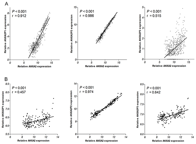 Figure 3: Correlations of ANXA2 expression with ANXA2 pseudogenes expression in TCGA dataset (A) and 4290 dataset (B).