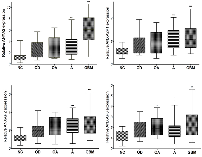 Figure 4: The qRT-PCR analysis of relative ANXA2 and ANXA2 pseudogenes expression level in 99 cases of tissues from diffuse glioma patients and 12 cases of non-tumor brain tissues. (13 cases of OD, 10 cases of OA, 50 cases of A, 26 cases of GBM and 12 cases of NC. *: P<0.05, **: P<0.01, ***: P<0.001) Abbreviations: NC: non-tumor, OD: oligodendroglioma OA: oligoastrocytoma, A: astrocytoma, GBM: glioblastomas.