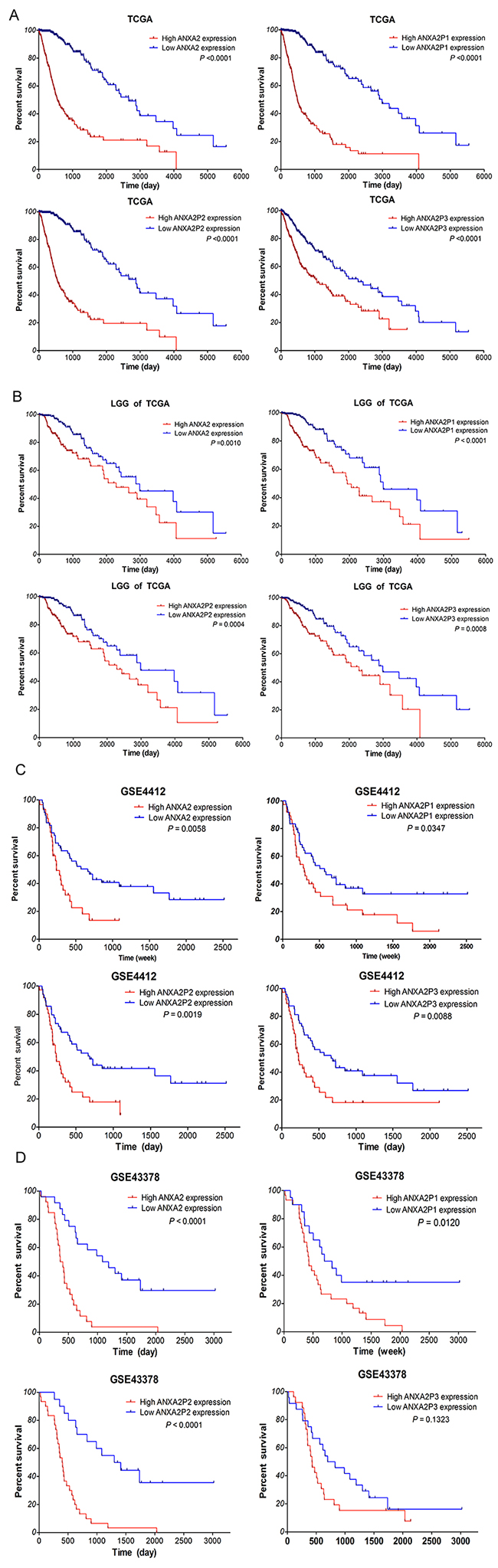 Next, to investigate the connections between the gene expressions with the OS, we analyzed the independent glioma gene expression data of TCGA and GEO datasets by Kaplan–Meier analysis and a log-rank comparison. The glioma patients were divided into low expression group and high expression group using the mean value of gene expression as the cutoff point. As shown in Figure 5A, analysis of TCGA dataset, the OS of glioma patients with high expression of ANXA2 and its pseudogenes were significantly worse than that with low expression (all P<0.0001). Moreover, to analyze the LGG subtypes of TCGA samples, the LGG patients with low expression of ANXA2 and its pseudogenes had better OS than that with low expression (P=0.0010, P<0.0001, P<0.0004, P=0.0008, respectively; Figure 5B). Additionally, in GSE4412 dataset, the OS of glioma patients with high expression of ANXA2 and its pseudogenes were noticeably worse than that with low expression (P=0.0058, P=0.0347, P=0.0019, P=0.0088, respectively; Figure 5C), and even more significant results were obtained from GSE43378 datasets (P<0.0001, P=0.0120, P<0.0001, P=0.1323, Figure 5D).