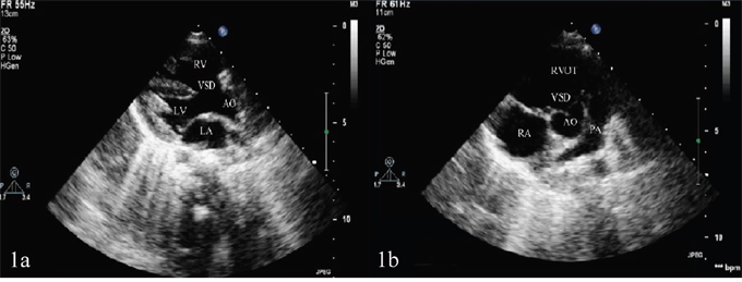 Figure 1: (A) Ventricular septal defect and aortic overriding shown in the left ventricular long-axis view of transthoracic echocardiography. (B) Pulmonary artery stenosis shown in the aorta short-axis view of transthoracic echocardiography.