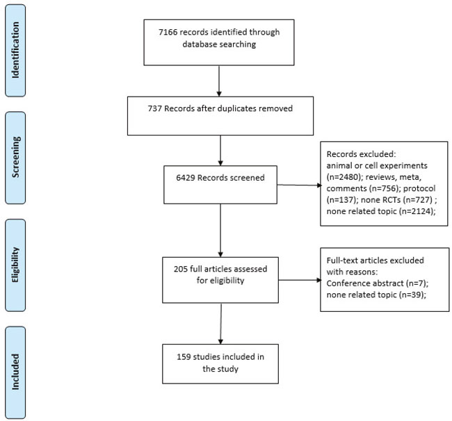 Two researchers (LL and ZL) used the EpiData 3.1 software (The EpiData Association, Odense, Denmark) to extract and enter the findings from the final included reports by using a unified structure form. Data extracted from each study included the title, publication year, regions where RCTs were conducted, impact factor, single center/multi-center, study groups, choice of interventions, human systems, sample size and funding sources.