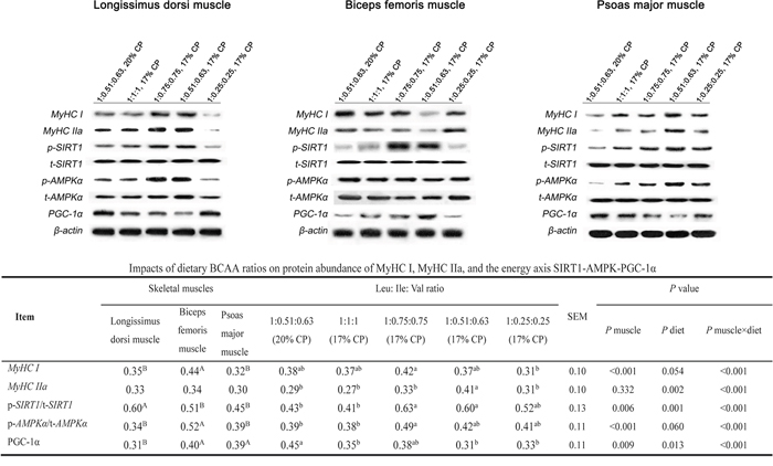 Figure 1: Protein abundance levels of MyCH I, MyCH IIa, and p/t-SIRT1, p/t-AMPKα, PGC-1α in the longissimus dorsi muscle, biceps femoris muscle, and psoas major muscle of growing pigs fed low-protein diets supplemented with varying BCAA ratios. Data were normalized to the value of corresponding total protein or the inner control β-actin and expressed as means ± SE (n = 8). Values within a row with different superscripts differ significantly (P < 0.05).