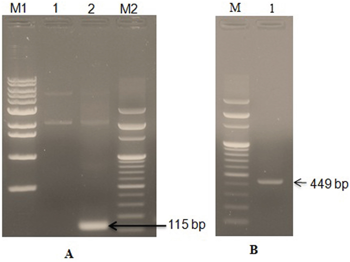 Figure 1: PCR detection and amplification of LFcinB gene in the pGEM-B1 plasmid. Panel A: PCR detection of bovine lactoferricin gene in the pGEM-B1 vector with detection primer. Lane M1- 1 kb DNA ladder; Lane 1- pGEM-B1 vector with LFcinB gene; Lane 2- PCR detected LFcinB gene (115 bp) and Lane M2- 100 bp DNA ladder. Panel B: PCR amplification of bovine lactoferrin gene from the pGEM-B1 vector using cloning primer. Lane M- 100 bp DNA ladder and Lane 2- PCR amplified lactoferrin gene (449 bp).