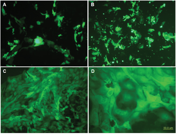 Figure 3: Transfection, expression and establishment of bovine mammary epithelial stable cell lines with recombinant PiggyBac-LFcinB. (A) Expression of Pmax GFP (positive control) after 24 h of transfection (100x); (B) Expression of recombinant bovine lactoferricin GFP after 24 h of transfection (100x); (C) Purified recombinant bovine lactoferricin cell line after 14 days of transfection in puromycin as selection marker (100x); (D) Purified recombinant bovine lactoferricin cell line after 14 days of transfection in puromycin which was used as selection marker at high resolution (200x). Cells showed the clear morphology of bovine mammary epithelial stem cells with nucleus and nucleolus.
