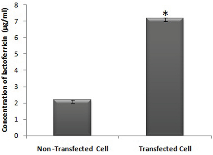 The dramatic increase of LFcinB secretionwas noticed in the transfected BMESCs in in-vitro culture system. In the non-transfected cell, the concentration of LFcinB in the medium was found to be 2 μg/ml whereas transfected cells had three folds higher LFcinB production ability (Figure 4). It suggests that the LFcinB transfected cells may be used as good source of LFcinB with antibacterial property and can protect mammary gland from intramammary infections by providing innate immunity. The increased production of LFcinB has gained a significant interest to study the antibacterial efficacy of LFcinB in transfected cells media as such.