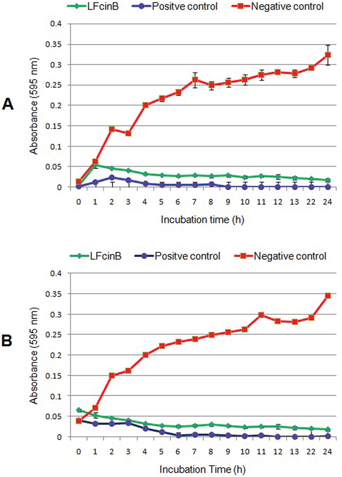 The antimicrobial kinetic study of recombinant bovine lactoferricin was performed by broth microwell assay, and the growth of bacteria was determined at different time points. Data obtained from these assays established that LFcinB has strong antibacterial activity against both S. aureus (Figure 7A) and E. coli (Figure 7B) when compared to control. Absorbance values obtained from LFcinB treated group were compared with those obtained for the standard antibiotic treated group against both isolates. The results of the kinetic study clearly confirmed the antibacterial activity from 4 to 5 h onward.