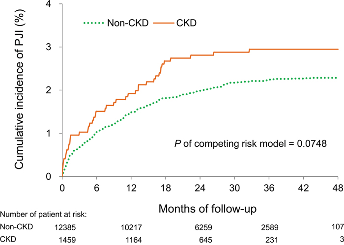 Figure 2: Cumulative incidence of PJI. Patients with CKD tended to have a higher cumulative incidence of PJI than those without CKD, although the difference was not statistically significant (P=0.0748, competing risk survival model).