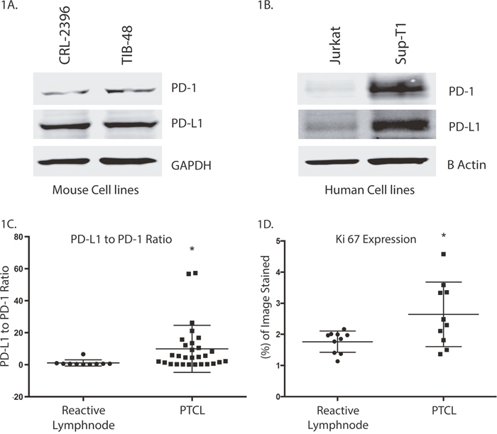 Figure 1: PD-L1 is differentially over-expressed relative to PD-1 in PTCL. Mouse (A) and human (B) PTCL cell lines over-express PD-L1 relative to PD-1 by Western blotting. CRL-2396, TIB-48, Jurkat and SUP-T1 cells were lysed and probed by Western blotting PD-L1 and PD-1. The ratio of PD-L1: PD-1 is high. IHC analysis of PD-L1 and PD-1 from SWOG1108 shows reactive lymph node control has a low PD-L1: PD-1 ratio. In contrast, PTCL samples show a ~9-fold increased ratio for PD-L1: PD-1 expression (C) and ki-67 over-expression (D).