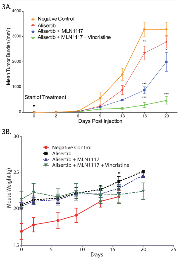 Figure 3: A combination therapy of alisertib plus VCR plus PI3Kα inhibition displays strong anti-proliferative activity in a PTCL mouse xenograft model. A PTCL mouse xenograft model (CRL-2396 cells in BALB/c) evaluating AK + PI3Kα inhibition. There was a significant decrease in mean tumor burden between control versus alisertib alone on day 16 (mean decrease of 497mm3, p=0.012), versus the combination of alisertib + MLN1117 (mean decrease of 1288mm3 on day 16, p<0.001) on days 13, 16 and 20 (A). All treatments were well tolerated with no body weight changes except on day-16 there was only significant changes between negative control group and alisertib as a single agent group with p=0.043 (B).