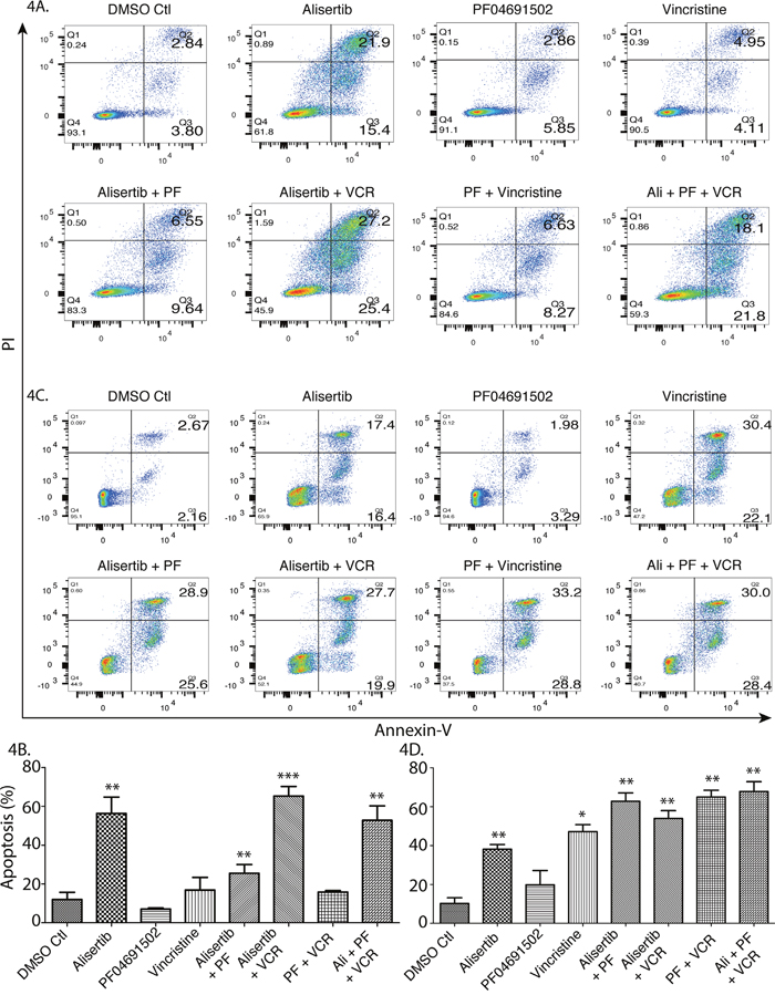 Figure 4: A combination therapy of alisertib plus VCR plus pan-PI3K inhibition induces apoptotic cell death. CRL 2396 cells (A) were treated with 50nM alisertib, 1.5μM PF04691502, 0.75nM vincristine and their combination for 4 days and SUP-T1 cells (C) were treated with 50nM alisertib, 500nM PF04691502, 2.0nM vincristine and their combination for 4 days followed by Flow cytometry for analysis of apoptosis; quantified and expressed as mean ± S.E. in (B) and (D) respectively.